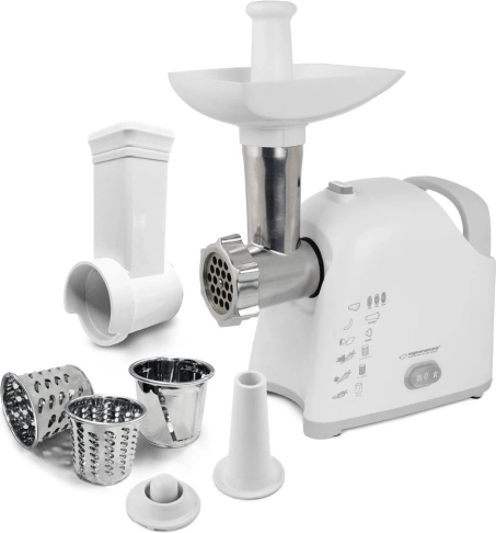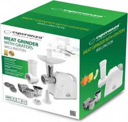 De universele vleesmolen met rasp ESPERANZA Wellington combineert hoog vermogen en praktische toepasbaarheid voor elke keuken. Dankzij de motor met een vermogen tot 2200 W maal je moeiteloos vlees en andere ingrediënten, en met drie maalplaten bereik je de gewenste grofheid. Verwisselbare opzetstukken maken het mogelijk om worsten en kebab/kebbe te maken, terwijl drie trommelraspen snel fruit, groenten, kaas, chocolade of noten verwerken. Een metalen wormaandrijving, roestvrijstalen mes en antislipvoetjes zorgen voor een lange levensduur en veilig gebruik.