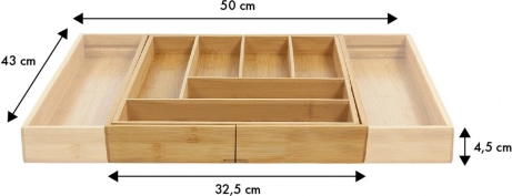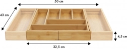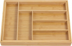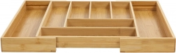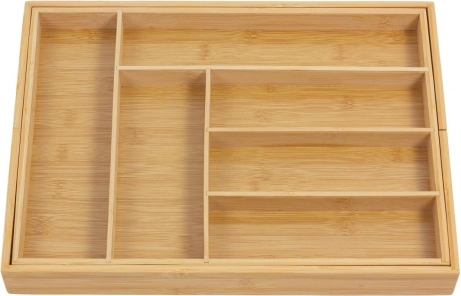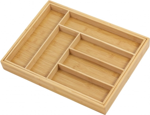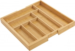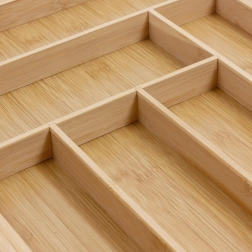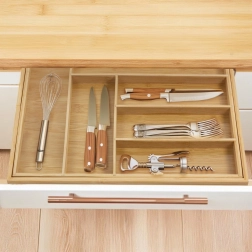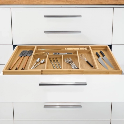 Houd orde in de keuken met de universele bamboe organizer die zich aan uw lade aanpast. De uitschuifbare zijdelen creëren extra ruimte en samen met de stevige tussenschotten blijft alles overzichtelijk op zijn plek. De natuurlijke look van massief bamboe past zowel in moderne als klassieke interieurs.