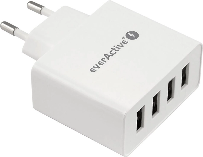 EverActive SC-400 is een robuuste netstroomoplader met vier USB-poorten en iQ Smart Charging-technologie. Hij komt van pas overal waar het aantal stopcontacten beperkt is en waar het niet mogelijk is om met een standaard oplader met één poort meerdere apparaten tegelijk op te laden.