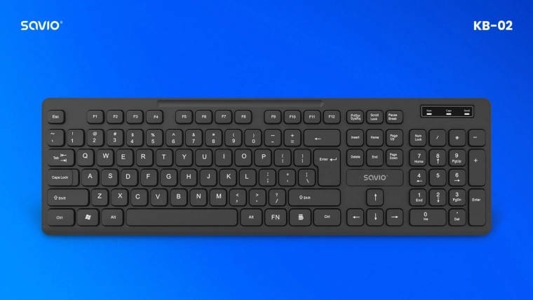 Elegant en betrouwbaar draadloos toetsenbord Savio KB-02 biedt een stabiele 2,4 GHz-verbinding, een volledig US-layout (104 toetsen) en een laag profiel voor comfortabel typen thuis en op kantoor. Dankzij een toetslevensduur tot 8 miljoen aanslagen en eenvoudige Plug & Play is het de ideale keuze voor dagelijks werken zonder kabels.