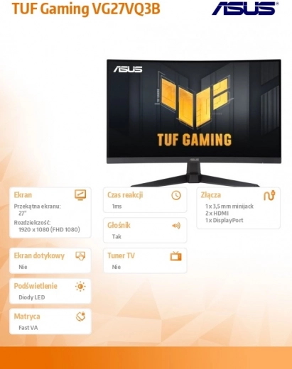 De ASUS TUF Gaming VG27VQ3B is een 27" gamingmonitor die een gebogen scherm voor betere onderdompeling combineert met een razendsnelle 1 ms respons en praktische aansluitingen via 2× HDMI en DisplayPort. Dankzij gamingoptimalisaties en de robuuste TUF-bouw is hij ideaal voor gamers die stabiele prestaties zonder compromissen willen.