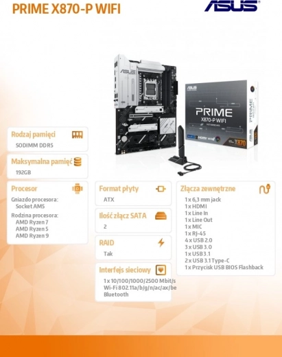 Het ASUS Prime X870-P WiFi moederbord ontgrendelt de volledige prestaties van AMD Ryzen processors voor het AM5-platform. Het biedt stabiele stroomvoorziening met een robuuste VRM, uitgebreide koeling met geïntegreerde heatsinks en slimme tuningtools voor eenvoudige optimalisatie. Inclusief ondersteuning voor DDR5, moderne connectiviteit zoals Wi‑Fi, HDMI en USB‑C – klaar voor veeleisende toepassingen en pc’s met geavanceerde AI.
