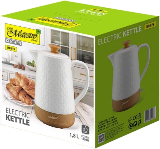 De elegante keramische waterkoker MAESTRO met een inhoud van 1,8 l en een vermogen van 1800 W kookt snel water voor het hele gezin. De combinatie van keramiek en bamboe zorgt voor een natuurlijke uitstraling; de 360° draaivoet, verlichte schakelaar en automatische uitschakeling met oververhittingsbeveiliging maken het gebruik comfortabel en veilig.