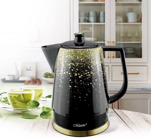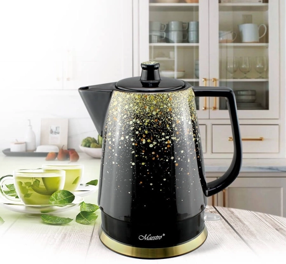 Elegante keramische waterkoker Maestro met een inhoud van 1,5 l en een vermogen van 1500 W brengt water snel aan de kook en maakt dagelijks gebruik plezierig. Biedt een 360° draaibaar onderstel en opbergruimte voor de kabel, een verlichte aan/uit-schakelaar en automatische uitschakeling na het koken. Het verborgen verwarmingselement vergemakkelijkt het reinigen, antislipvoetjes zorgen voor stabiliteit en de interne maximum-niveau-indicator helpt bij nauwkeurig schenken.
