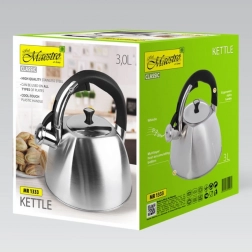 De Maestro theepot heeft een niet-verwarmend handvat voor comfort en veiligheid bij het hanteren. Een praktische fluit geeft aan wanneer het kookpunt is bereikt. Een afneembaar deksel vergemakkelijkt het gieten van water en schoonmaken.