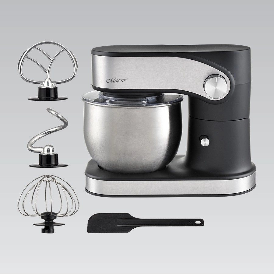 Bijgeleverd zijn een kneedhaak, een mengkraan/roermes en een ballongarde, zodat je brood, pannenkoeken en luchtig eiwitschuim kunt bereiden. De transparante spatbescherming met opening voorkomt spatten en laat je tijdens het draaien ingrediënten toevoegen. Voor gemakkelijk gebruik is er automatisch kantelen van de kop, de antislip rubberen voetjes zorgen voor stabiliteit en de vergrendeling en oververhittingsbeveiliging verhogen de veiligheid.