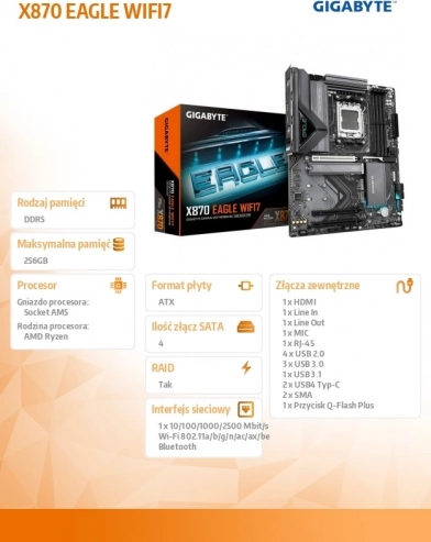Het GIGABYTE X870 EAGLE WIFI 7 moederbord voor AMD AM5 ondersteunt Ryzen 9000/8000/7000 processoren, biedt PCIe 5.0, drie M.2‑sleuven, snel netwerk met 2.5GbE + Wi‑Fi 7 en handige EZ-Latch functies voor schroefloze installatie. Stabiele voeding wordt geleverd door 14+2+2 VRM en effectieve koeling door VRM Thermal Armor en M.2 Thermal Guard. Voor veeleisende gamers en creators biedt het eenvoudig éénklik-opschalen van DDR5 en uitgebreide connectiviteit inclusief dubbele USB4 Type‑C en HDMI.