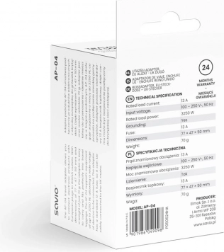 Veiligheid is een van de belangrijkste voordelen van deze adapter. Hij is uitgerust met aarding en een verwisselbare zekering van 13 A, wat een hoog beschermingsniveau garandeert. Kwalitatieve afwerking en duurzame materialen staan garant voor betrouwbaarheid en een lange levensduur van de adapter.