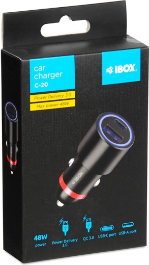 De krachtige IBOX-autolader met een totaal vermogen van 48 W ondersteunt PD 3.0 en QC 3.0, zodat uw apparaten snel worden opgeladen. Dankzij de poorten USB‑A en USB‑C kunt u twee apparaten tegelijk opladen – aanzienlijk sneller dan met gewone laders.