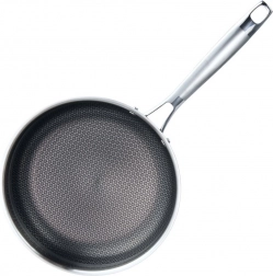 De robuuste roestvrijstalen pan met een diameter van 26 cm is ontworpen voor precieze resultaten en een lange levensduur. De drievoudige sandwichbodem combineert een buitenlaag van magnetisch RVS 430, een aluminium kern voor uitstekende warmtegeleiding en een binnenlaag van voedselveilig RVS 304. Het getextureerde oppervlak met een hexagonaal “honingraat”-patroon verhoogt de krasbestendigheid en bevordert de antiaanbakwerking.