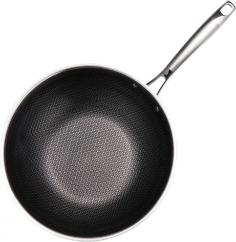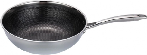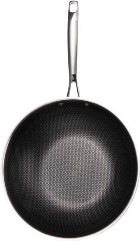 Robuuste MAESTRO-wok met een diameter van 30 cm. De driedubbele roestvrijstalen behuizing met aluminium kern zorgt voor snelle en gelijkmatige warmteverdeling, krassenbestendigheid en een anti-aanbaklaag met honingraatstructuur. Geschikt voor alle soorten kookplaten, inclusief inductie, met een comfortabele roestvrijstalen handgreep die niet oververhit, en vaatwasserbestendig.
