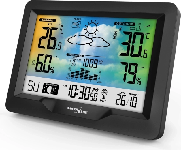 Modern draadloos weerstation GREENBLUE met een kleurendisplay, DCF-radiogestuurde tijd, binnen- en buitentemperatuur- en vochtigheidsmeting, barometer, maanfasen en grafische weersvoorspelling. Dankzij de draadloze sensor bewaakt hij omstandigheden tot 60 m afstand en de comfortindicator helpt een gezond binnenklimaat te behouden.