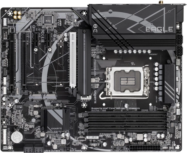 Krachtig moederbord GIGABYTE Z790 EAGLE AX voor Intel Core processoren van de 12e/13e/14e generatie biedt stabiele voeding met een 12+1+1-fasen digitaal VRM, sneld werkend DDR5-geheugen (XMP 3.0), drie M.2 PCIe 4.0-sleuven, moderne connectiviteit met 2.5GbE LAN en Wi‑Fi 6E, plus praktische functies zoals EZ-Latch en Q-Flash Plus.