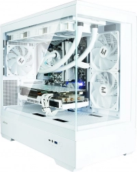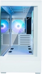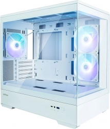 Deze moderne mini-tower voor MicroATX valt op door het strakke design en de eersteklas presentatie van componenten. Twee randloze panelen van gehard glas bieden een indrukwekkend panoramisch uitzicht op je systeem, terwijl de voorgeïnstalleerde 3× 120 mm adresseerbare RGB-ventilatoren zorgen voor efficiënte en stille koeling met volledige personalisatie.