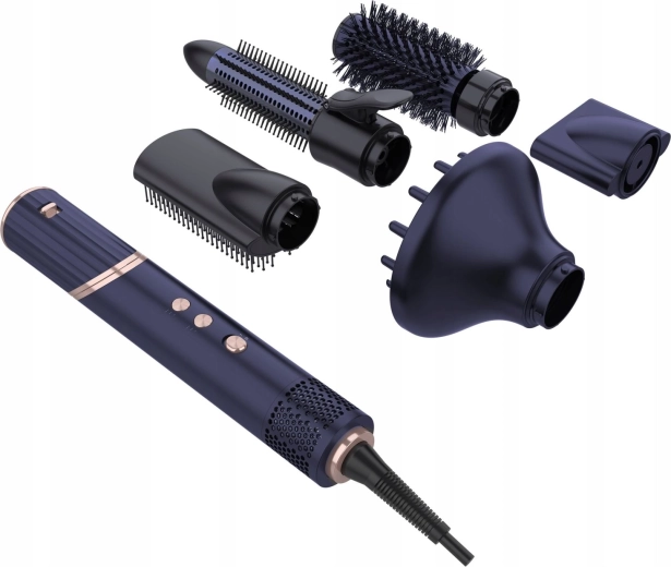 Vijf afneembare opzetstukken dekken drogen, gladmaken en het creëren van krullen en volume: diffuser, concentrator, platte, roterende en ronde borstel.