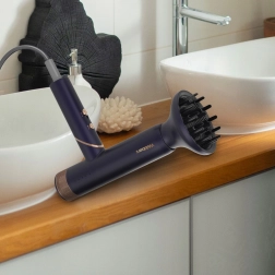 De concentrator richt de luchtstroom precies voor een gladde brushing en een pony. De diffuser verspreidt de lucht gelijkmatig, ondersteunt natuurlijke golven en volume zonder pluizen.