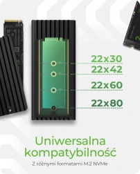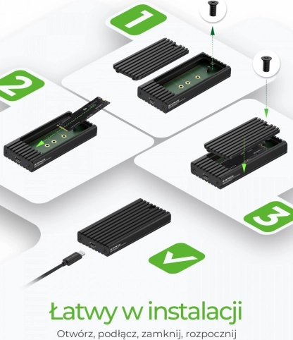 Dankzij de ondersteuning voor lengtes van 30/42/60/80 mm krijgt u een universele oplossing voor de meeste NVMe‑modules. Montage is snel en comfortabel – na het losmaken van het deksel klikt u de schijf eenvoudig vast zonder schroeven en kunt u direct aan de slag. Het ultracompacte ontwerp past in elke tas, zodat u uw data altijd bij de hand hebt.