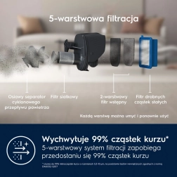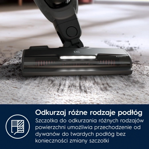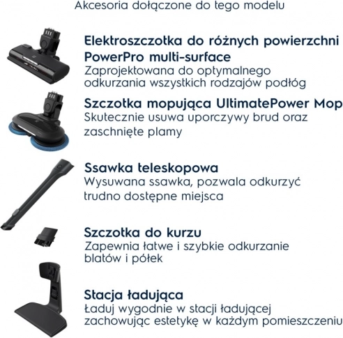 De stofzuiger wordt geleverd met: een elektrische borstel voor tapijten en harde vloeren met PowerPro Multifloor LED-verlichting, PowerPro Mop-dweilborstel, telescopische kierenzuigmond, stofborstel en laadstation. Eenvoudige toegang tot de handunit en de meegeleverde accessoires stelt je in staat verschillende oppervlakken grondig en snel te reinigen – van de vloer tot moeilijk bereikbare hoekjes.