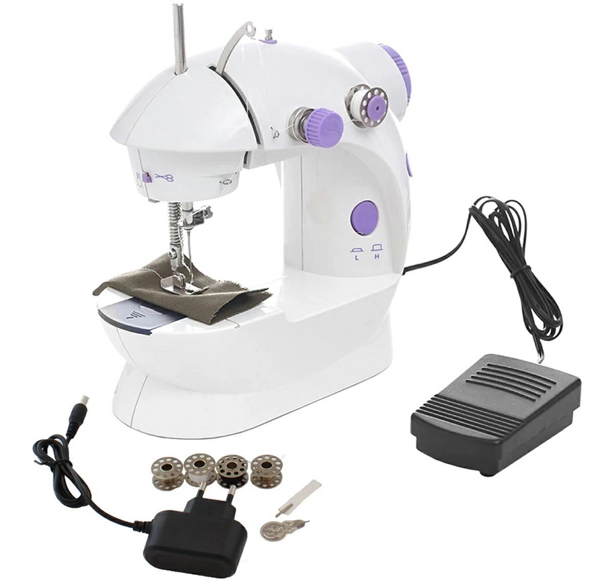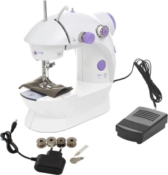 Deze gemakkelijk draagbare mini-naaimachine is gemaakt van duurzaam kunststof en is ideaal voor wie net begint met naaien of als aanvulling op een standaard naaimachine. Het apparaat kan worden bediend met een pedaal of met een speciale knop op de behuizing.