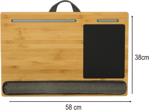 De elegante houten schoottafel combineert comfort, functionaliteit en duurzaamheid. Het natuurlijke houten blad is stevig en aangenaam om aan te raken, terwijl de zachte kussenbodem zich aan je knieën aanpast en stabiliteit zonder schuiven biedt. De ergonomische polssteun vermindert vermoeidheid bij langer werken op de laptop.