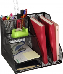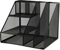 Breng orde op uw bureau met deze elegante metalen organizer. Met zes verschillende vakken kunt u gemakkelijk pennen, scharen, paperclips en meer organiseren. Hoge, verticale vakken zijn ideaal voor het opbergen van kalenders, notitieboekjes of documentenmappen.
