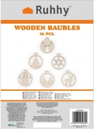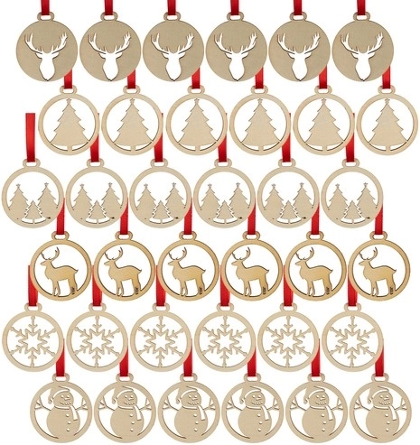 De set bevat 36 houten ornamenten, linten en koordjes die het ophangen eenvoudig maken en je decoratie een vleugje traditionele elegantie geven.