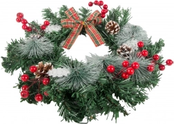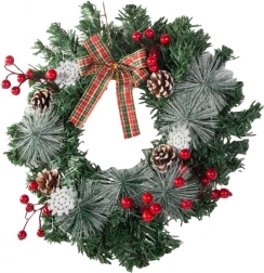 Traditionele kerstkrans van hoogwaardig kunstnaaldgroen, versierd met natuurlijke dennenappels, rode besjes, sneeuwvlokjes en een stijlvolle geruite strik. Dankzij de realistische look en het subtiele berijpte effect oogt hij authentiek en creëert hij direct een feestelijke sfeer.