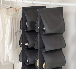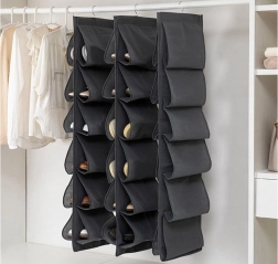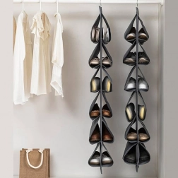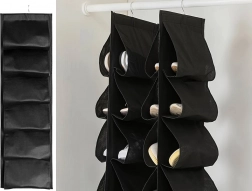 Een praktische en elegante oplossing voor elke garderobe. De hangende schoenenorganizer met 12 vakken bergt paren verticaal op, waardoor je meer ruimte en beter overzicht krijgt. De duurzame stof met verstevigde naden beschermt schoenen tegen schuren en stof, terwijl de metalen haak voor stabiel ophangen zorgt.