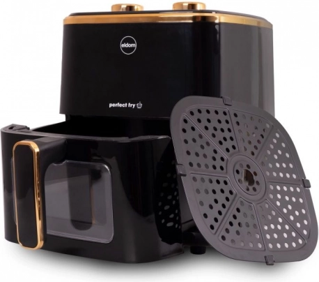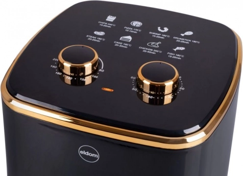 Geniet van knapperige en gezonde gerechten met de Eldom heteluchtfriteuse met een inhoud van 5 l. Dankzij de 360° circulatie van hete lucht bereid je maaltijden met tot 80% minder vet, terwijl smaak en kleur behouden blijven. Hij biedt 9 programma’s, snel voorverwarmen in 2 minuten, traploze temperatuurinstelling van 80–200 °C en een timer van 60 minuten. De bediening met twee draaiknoppen is intuïtief, de uitneembare mand met antiaanbaklaag is eenvoudig te reinigen en het apparaat heeft oververhittingsbeveiliging en antislipvoetjes.