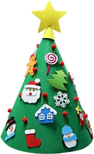 Vilt 3D kerstboompje voor kinderen. Een uitstekende speelgoedset voor de ontwikkeling van de creativiteit van de allerkleinsten. Uitgerust met een reeks afneembare versieringen die je op elke plek van de kerstboom kunt vast- en losmaken. Gemaakt van licht en veilig materiaal (vilt). Standaard bedoeld om op een oppervlak te plaatsen. Een speciale hanger maakt het ook mogelijk om aan de muur op te hangen.