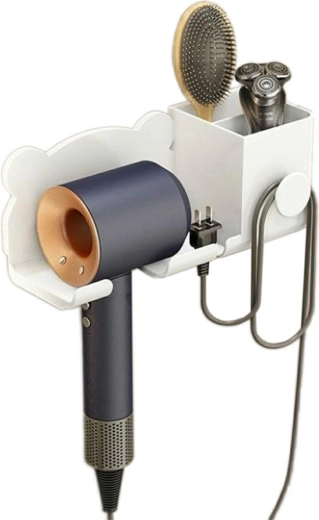 Muurhouder voor föhns. Uiterst comfortabel en ruimtebesparend. Zeer eenvoudige, niet-invasieve installatie met dubbelzijdige tape. Voorzien van twee vakjes voor kleine spullen en een extra haak aan de voorkant. Ideaal als extra plankje voor cosmetica of tandenborstels.
