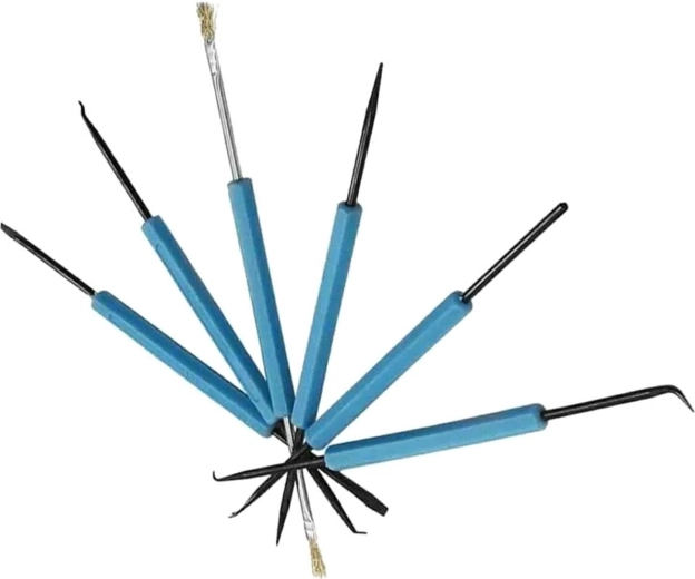 Een gereedschapsset die perfect is voor werkzaamheden die hoge precisie vereisen, zoals het openen van behuizingen van elektronische apparaten. Met elk gereedschap voorzien van twee uiteinden biedt de set in totaal 12 diverse tools, waaronder schrapers, haken en pennen.