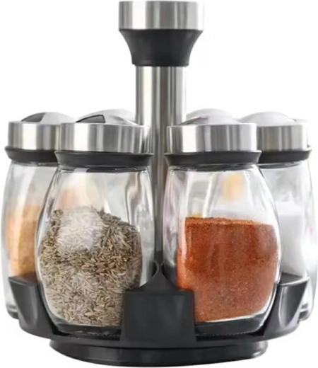 Set van 6 transparante kruidenpotjes met een speciale draaivoet. Een onmisbaar onderdeel van uw keukenuitrusting. Het heldere glas zorgt ervoor dat u geen moeite heeft om het juiste kruid te herkennen. Alle potjes hebben nauw geplaatste gaatjes voor een precieze dosering. De set is gemaakt van glas en roestvrij staal voor langdurig en probleemloos gebruik en past perfect in het interieur van elke keuken.