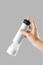 De transparante container biedt snelle visuele controle van het vulniveau en de bediening met één knop en één hand zorgt voor comfortabel gebruik tijdens het koken en aan tafel. Voeding via algemeen verkrijgbare AAA-batterijen garandeert draadloze mobiliteit.
