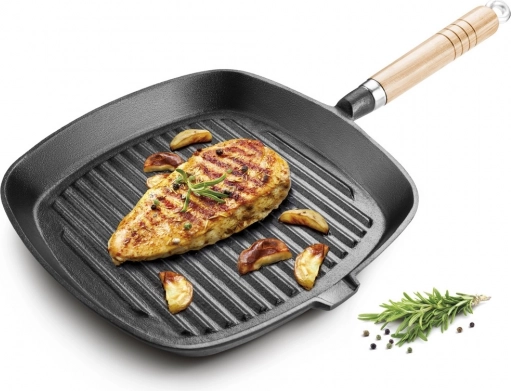 De gietijzeren grillpan is ideaal voor het bereiden van sappige steaks, groenten en vis. Hoogwaardig gietijzer zorgt voor een uitstekende warmteopslag en gelijkmatige warmtegeleiding, waardoor ingrediënten gelijkmatig garen en sappig blijven. De geribbelde binnenbodem creëert typische grillstrepen en maakt koken met een minimum aan olie mogelijk.
