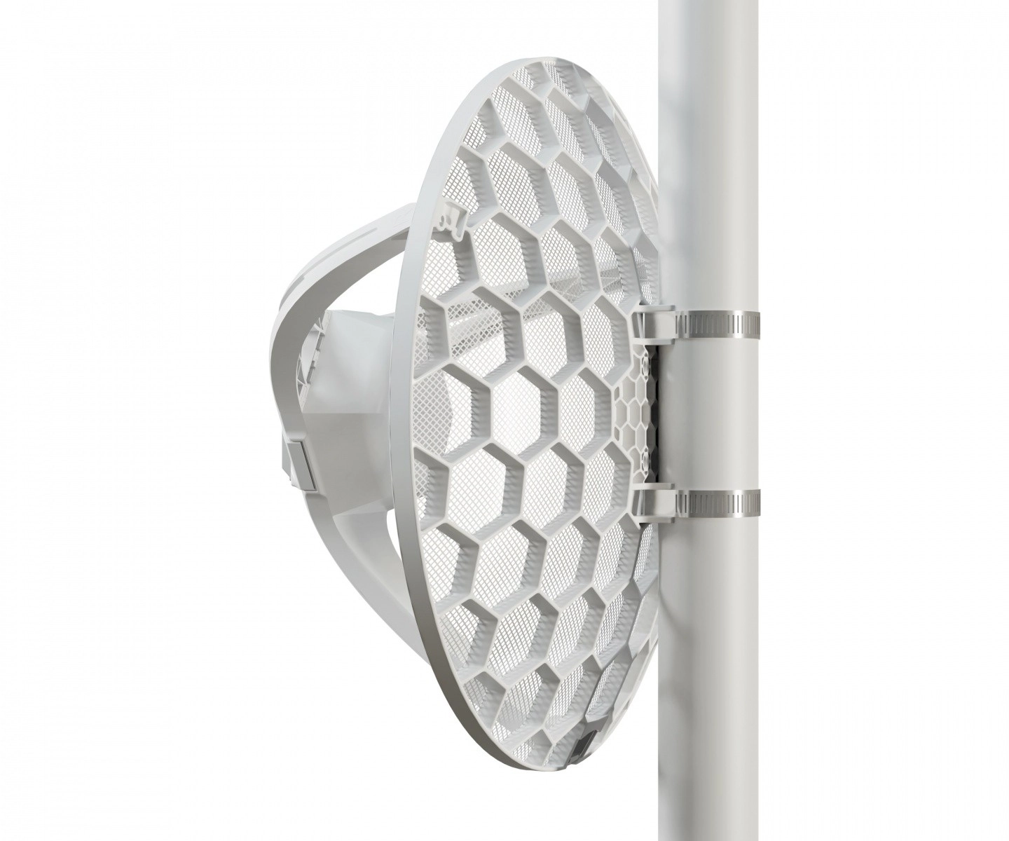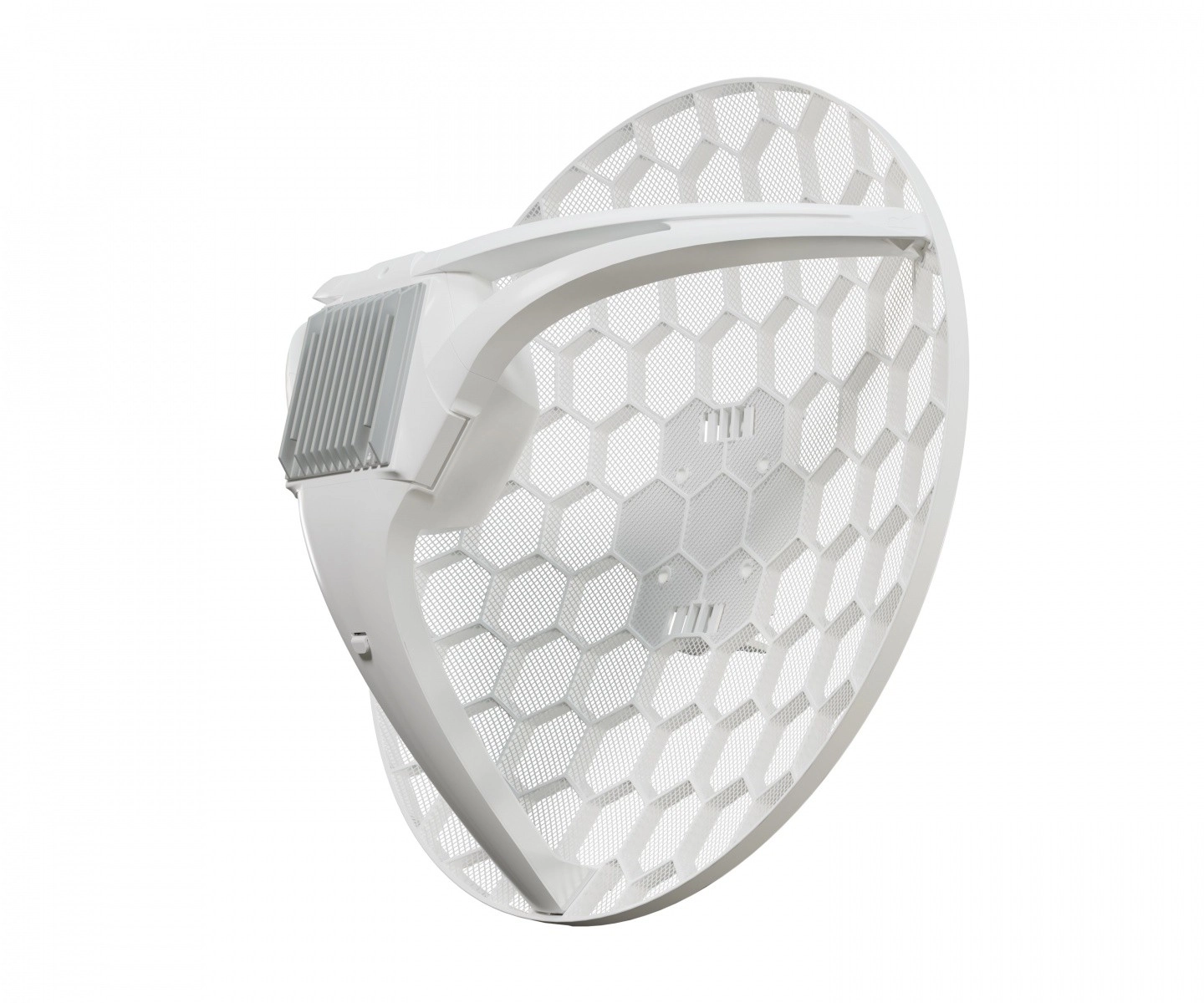 De robuuste behuizing met een vergrote koelplaat voorkomt oververhitting, terwijl de roosterschotel zorgt voor minimale windweerstand en stabiliteit. Installatie gaat snel: montage op paal/mast, voeding via Gigabit Ethernet met PoE (PoE‑injector inbegrepen), verbinding via MicroSIM. Intern zorgt een 64‑bit dual‑core ARM voor soepele werking en lage latentie.