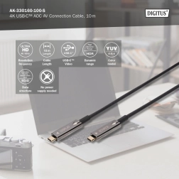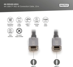 Actieve hybride USB‑C–USB‑C‑kabel voor overdracht van ongecomprimeerd beeld en geluid tot UHD 4K @ 60 Hz met een bandbreedte tot 21,6 Gbit/s. Dankzij de optisch‑koperen constructie is hij licht, flexibel en bestand tegen EMI, ideaal voor langere trajecten (10 m). Ondersteunt DisplayPort 1.2 en USB‑C DP Alt Mode, werkt volgens het plug‑and‑play principe zonder externe voeding.