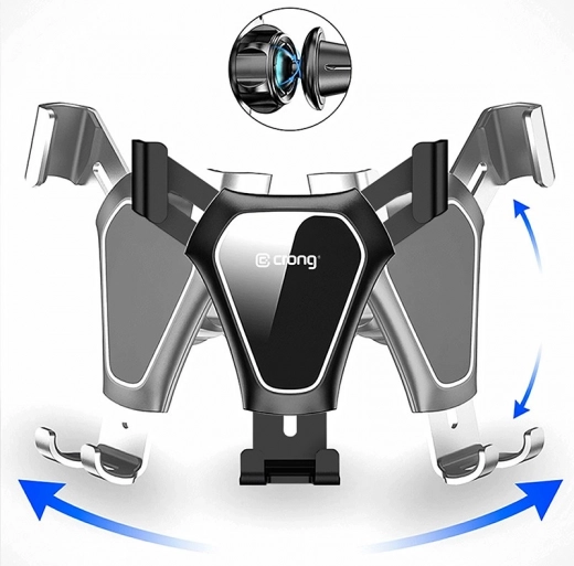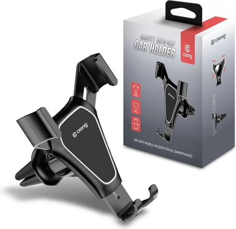 Praktische gravitatie-autohouder voor smartphones van 4,7–6,5" met bevestiging op het ventilatierooster. Dankzij automatisch gravitatieslot wordt de telefoon na plaatsing vanzelf stevig vastgezet. Antislip-inlays dempen trillingen, de draaibare kop maakt het mogelijk de ideale hoek in te stellen, en er is ruimte voor gebruik met hoesje tot een dikte van 15 mm.