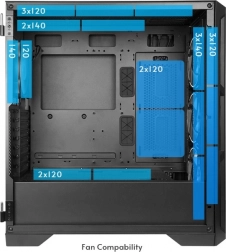 Het chassis is ruim en biedt ondersteuning voor grafische kaarten tot 400 mm lengte, CPU-koelers tot 175 mm hoogte en ondersteuning voor radiatoren tot 360 mm boven en tot 420 mm voor.