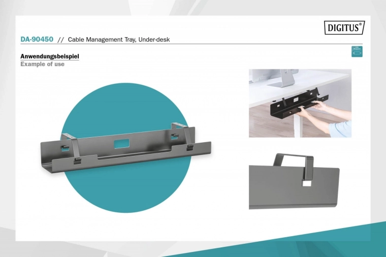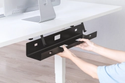 De kabelorganizer wordt eenvoudig met schroeven onder het bureau bevestigd. Dit zorgt voor een snelle en veilige installatie.