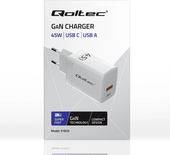 Qoltec 45W GaN oplader biedt je snel en efficiënt opladen dankzij de GaN‑technologie, die zorgt voor een lager energieverbruik en hogere veiligheid.