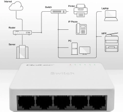 Installatie is zo gepiept: dankzij Plug & Play hoeft u alleen de kabels op de RJ45-poorten aan te sluiten en één poort met de router of modem te verbinden. Automatische kruisbekabeling (Auto MDI/MDI‑X) maakt speciale kabels overbodig en LED‑lampjes tonen duidelijk de status van de afzonderlijke lijnen.