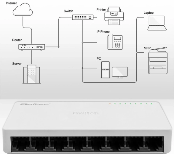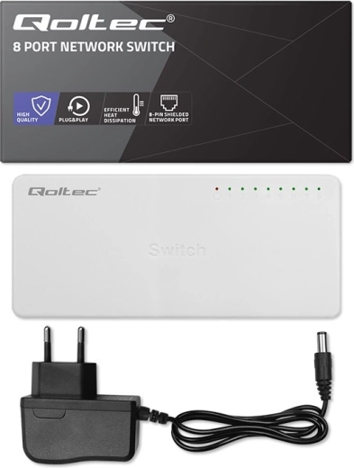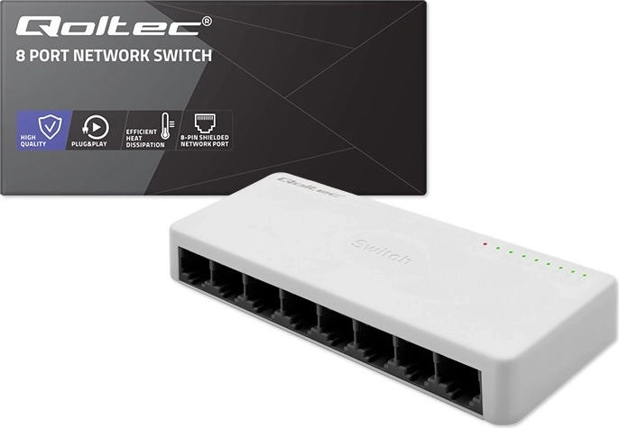 Betrouwbare netwerkswitch voor thuis en kantoor: QOLTEC met 8 RJ45‑poorten biedt overdracht tot 100 Mb/s en een stabiele verbinding voor meerdere apparaten. Dankzij Plug & Play, ondersteuning voor Auto MDI/MDIX, LED‑indicatie en afgeschermde 8‑pins poorten zorgt hij voor stabiele gegevensoverdracht en eenvoudige installatie zonder overbodige configuratie.