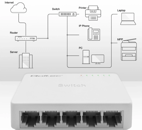 Aansluiten is eenvoudig: verbind apparaten met de overeenkomstige RJ45‑poorten, koppel één poort met de router of modem en controleer de activiteit via de LED’s. In slechts enkele stappen is uw netwerk klaar voor gebruik.