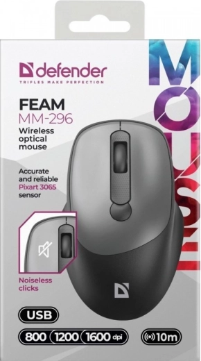 DEFENDER FEAM MM-296 is een betrouwbare draadloze muis, ontworpen voor dagelijks gebruik op kantoor en thuis. De stille schakelaars van de linker- en rechtermuisknop zorgen voor een stille werkomgeving, ideaal voor open spaces en nachtwerk. Dankzij de 1600 DPI-resolutie biedt hij vloeiende en nauwkeurige cursorbesturing.