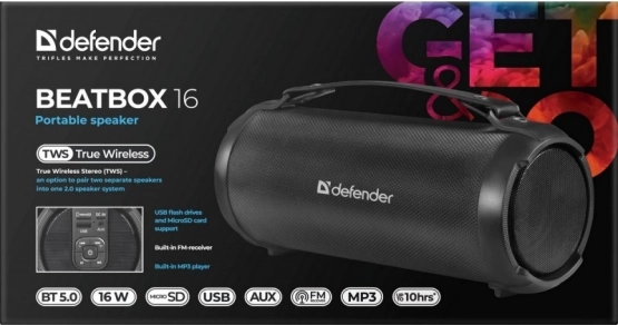Geniet overal van je favoriete muziek met de DEFENDER Beatbox 16-luidspreker. De cilindrische behuizing met praktische handgreep is gemakkelijk mee te nemen en het duurzame oppervlak is bestand tegen dagelijks gebruik. Het vermogen van 16 W zorgt voor verrassend krachtig en uitgebalanceerd geluid voor kleine feestjes, trainingen en ontspanning.
