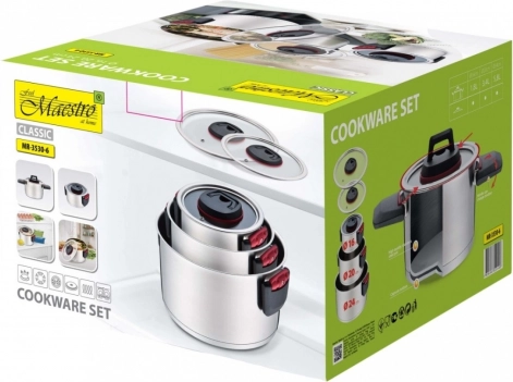- Inklapbare handgrepen voor eenvoudige opslag, meerlaags thermo-accumulerende bodem voor gelijkmatige verwarming, glazen deksels met stoomuitlaat, interne maatverdeling, geschikt voor de vaatwasser