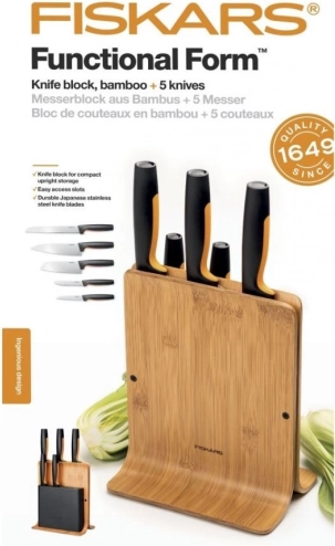 Praktische set keukenmessen in een elegant bamboeblok met veilige en comfortabele opslag, scherpe roestvrijstalen bladen en ergonomische handgrepen. Modern Fins design en een modulaire indeling zorgen voor gemakkelijke toegang tot elk mes, inclusief ruimte voor een schaar.