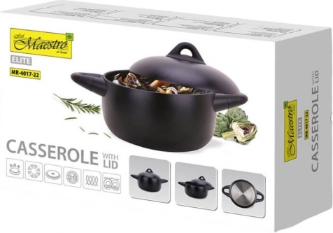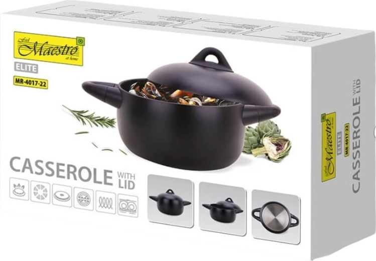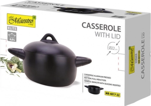 Deze elegante Maestro-pan is de perfecte partner voor uw keuken. Dankzij de volledige inductiebodem is hij compatibel met alle soorten kookplaten, waaronder inductie, gas en elektrisch. De met siliconen beklede handgrepen op de pan en het deksel zorgen voor een veilige en comfortabele grip tijdens het koken.