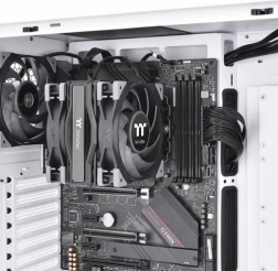 Twee hoogwaardige 120mm ventilatoren in push-pull-configuratie verhogen de statische druk en verbeteren de luchtstroom door de koelribben voor effectieve koeling, zelfs onder belasting.